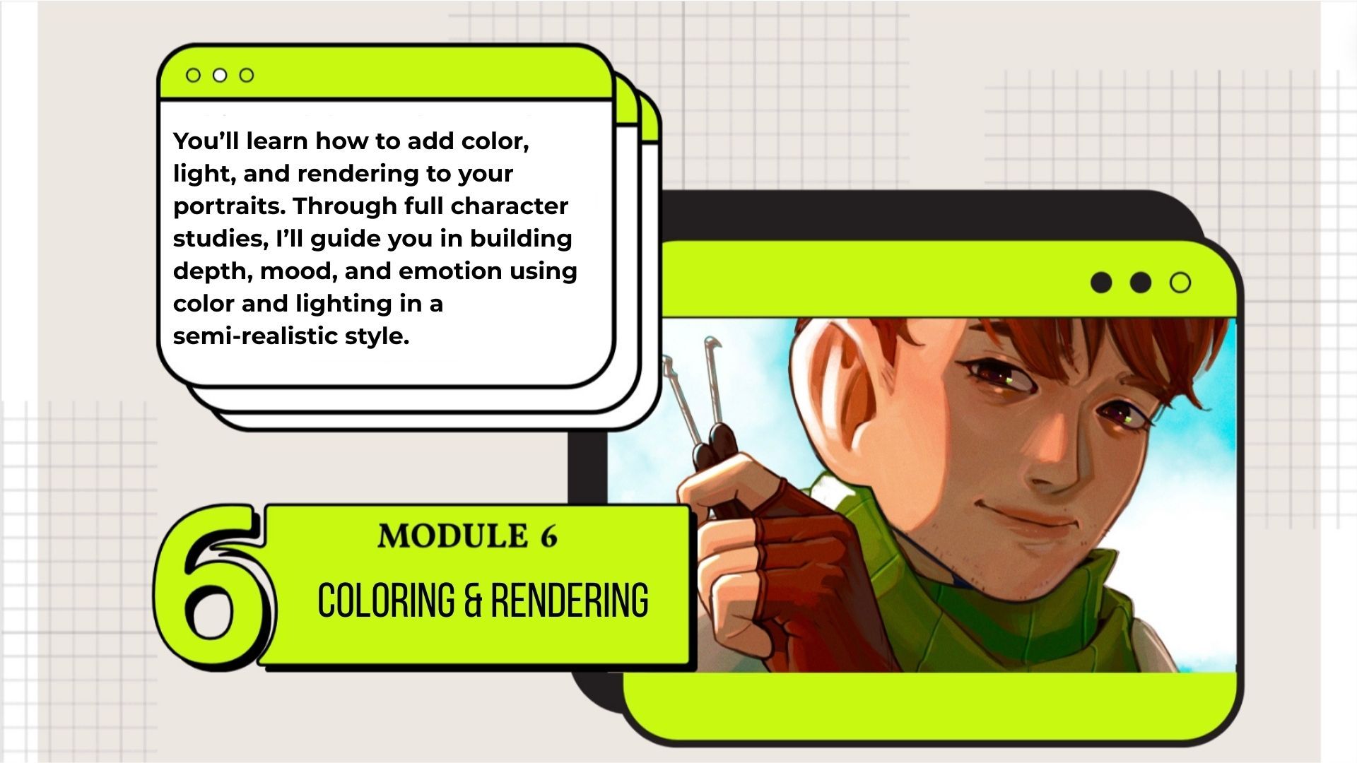 Bring Any Character to Life through Semi-Realistic Portraits is designed to help you build strong character-drawing and rendering skills while keeping the process approachable, supportive, and enjoyable. You’ll experience steady progress as you move from core fundamentals to confident, expressive character portraits — building trust in your creative choices one lesson at a time.